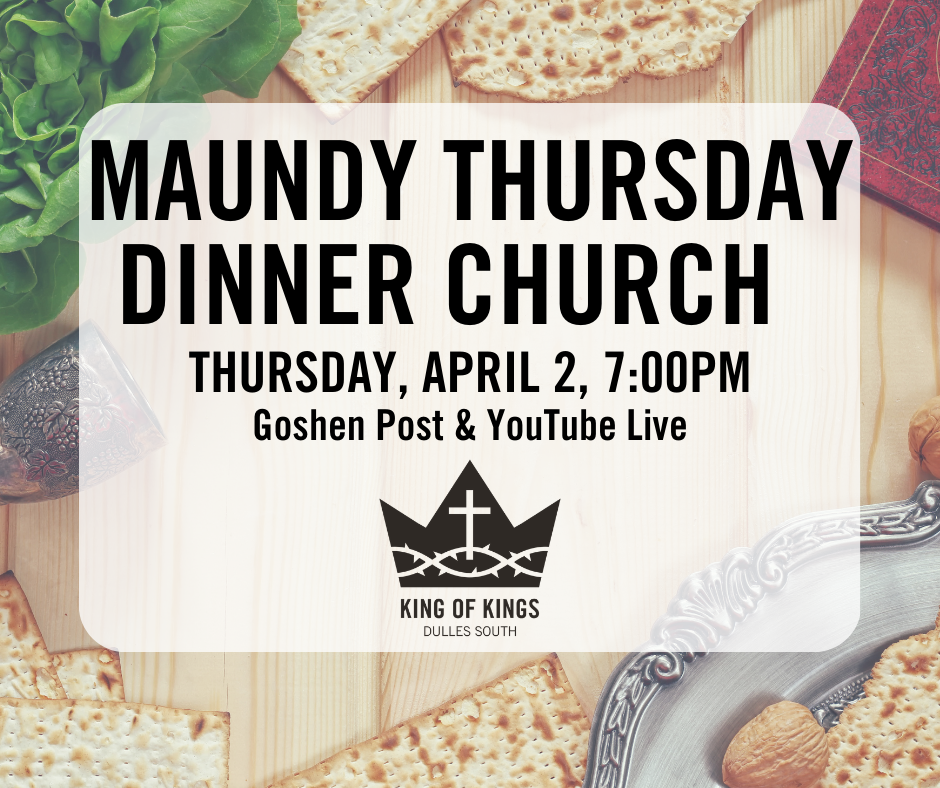 Join us on Thursday, April 2nd, at Goshen Post E.S. and YouTube Live for a Maundy Thursday Dinner Church Worship Service. On this night we end our Lenten season observance by remembering the events surrounding the last meal Jesus has with his disciples. Together, we will spend the evening in with Jesus and his disciples in the upper room by reading scripture, eating a meal, reflecting on our faith together, and sharing communion. Come as you are, bring a dish if you’re able, and join us as we prepare for Easter. All are welcome.