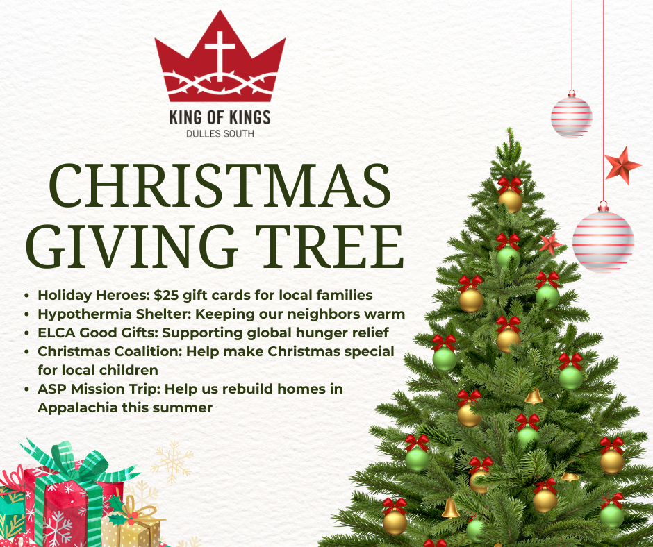 This year, the King of Kings Giving Tree is supporting five meaningful ministries! From local families to global neighbors, your generosity helps care for, serve, and share God’s love in countless ways. Opportunities include: Holiday Heroes ($25 gift cards for local families), Hypothermia Shelter (keeping neighbors warm), ELCA Good Gifts(supporting global hunger relief), Christmas Coalition (making Christmas special for local children), and ASP Mission Trip (helping rebuild homes in Appalachia this summer). Thank you for your continued support - your gifts make a real difference in our community and beyond. For more details, please see below.